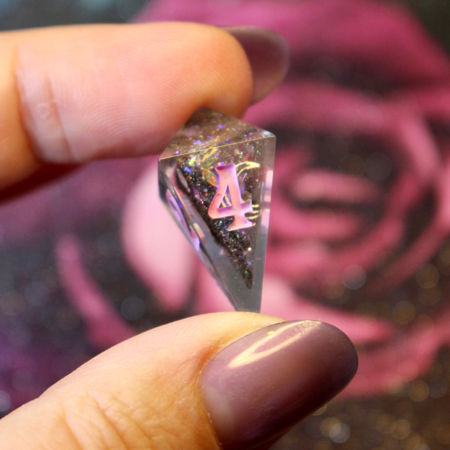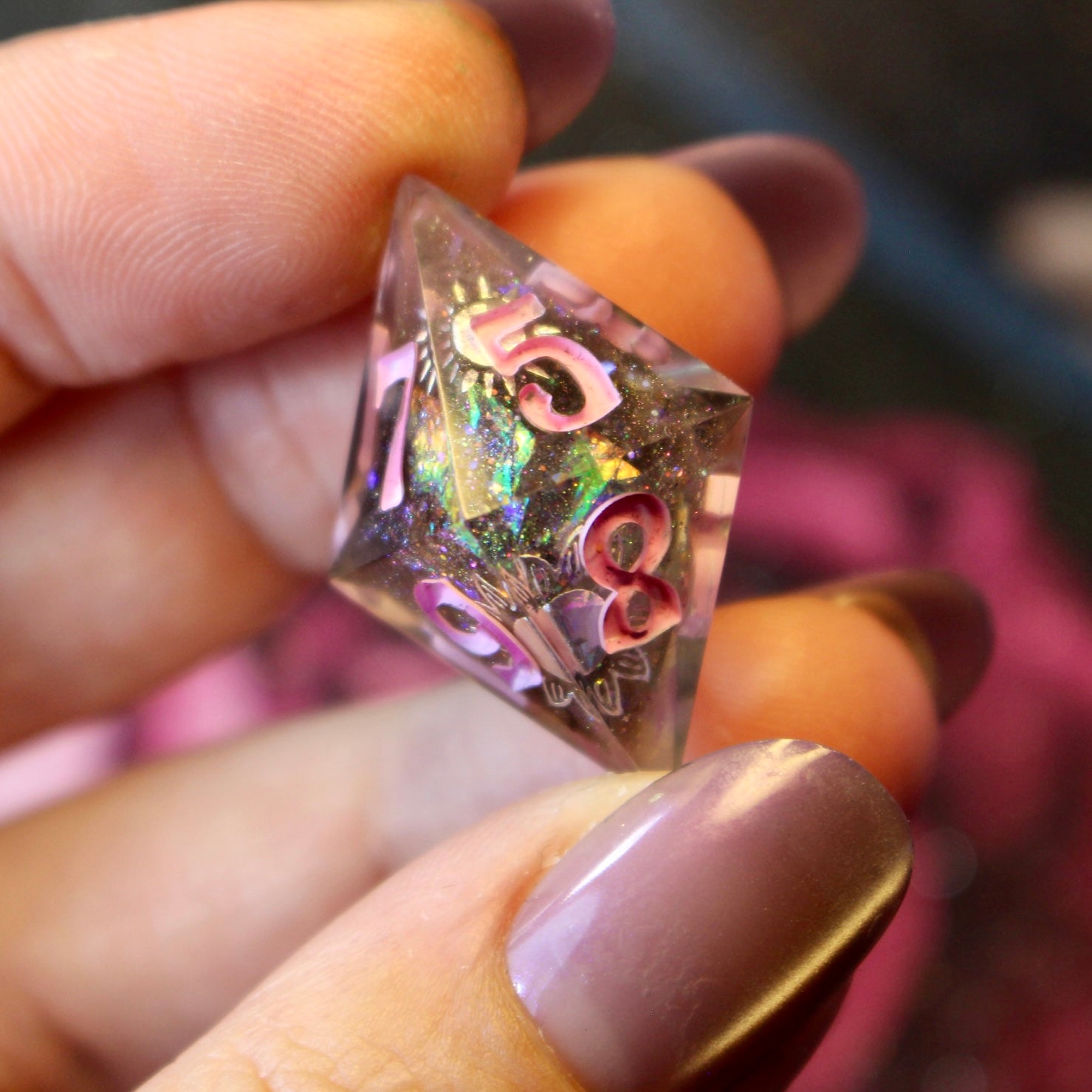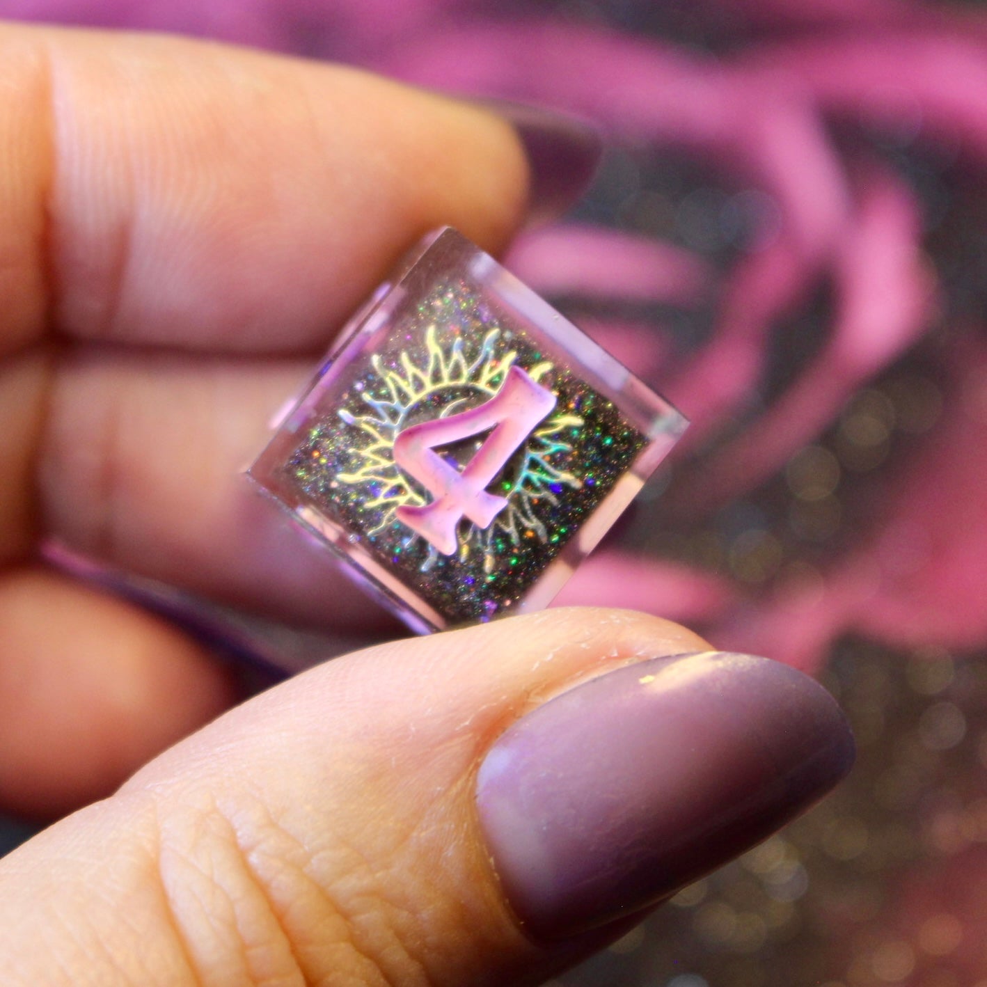 “Celestial Chaos" is a set of 8 hand made resin dice, polished and painted by me from non-toxic resin. Featuring sparkling space grey resin and stunning silver celestial symbols, cast in clear resin with pastel pink inked numbering.