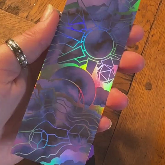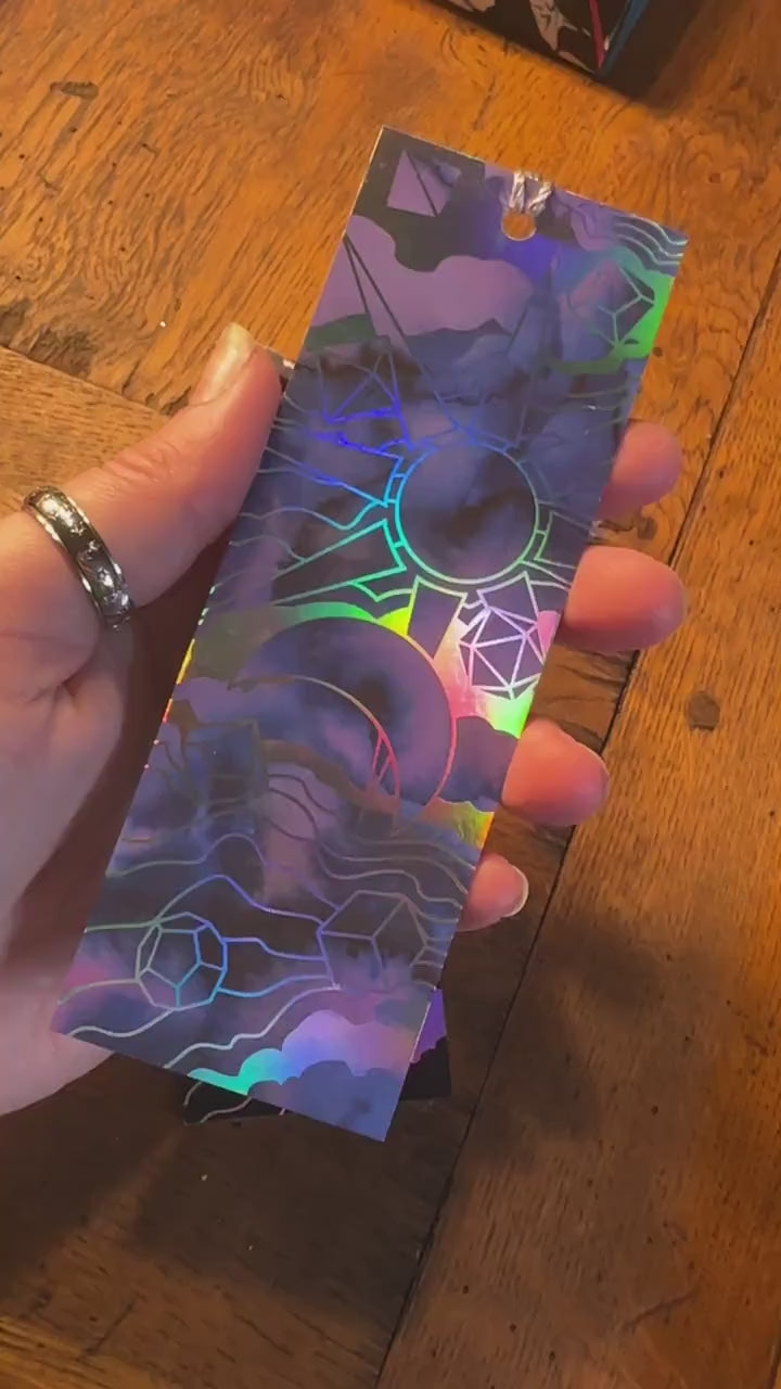 Need to keep your page in your book or game manual? Show your books some love with these magical bookmarks! Choose from deep black or galaxy ink printed on velvet touch 750gsm card with bold holographic line work which shimmers like a rainbow when you move them. Tassel is included!