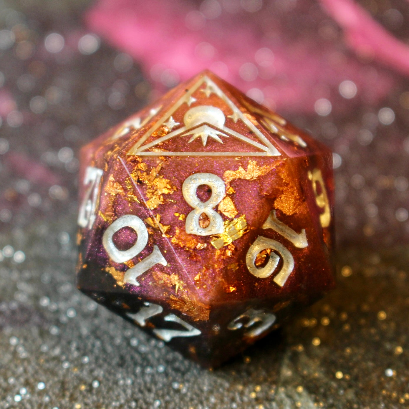 “Gilded Rose" is an oversize 30mm hand made resin D20, polished and painted myself by hand. Part of our signature Dark Sky Dice range, with my logo as the 20 face.