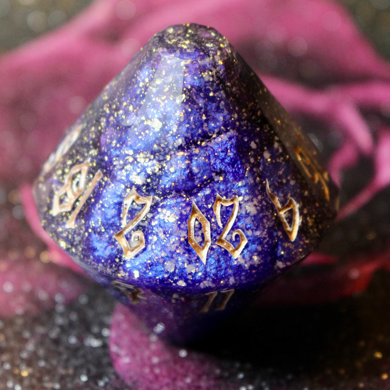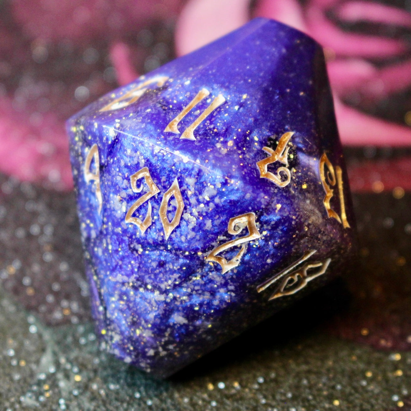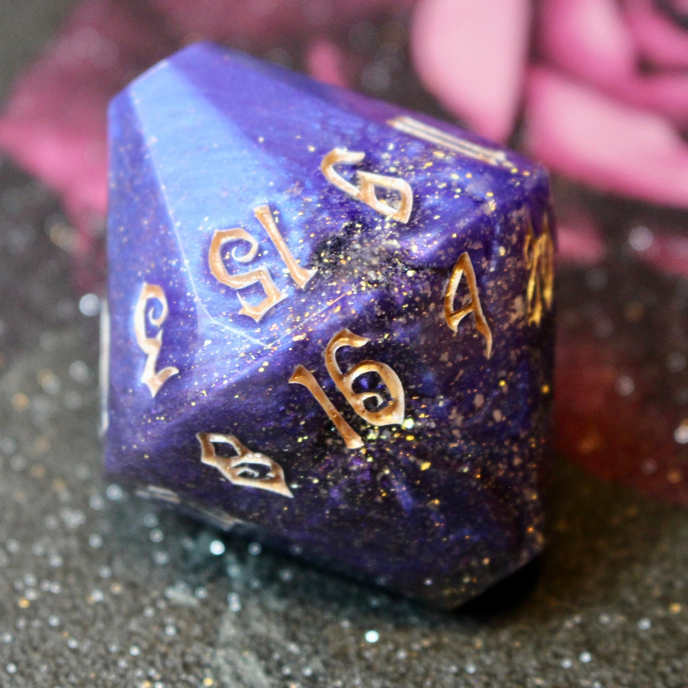 Featuring a striking starlit deep blue resin and rose gold inked numbers. Inspired by one of my favourite book series, This is the perfect die for those dramatic game-changing moments and would make the perfect gift for any TTRPG player.
