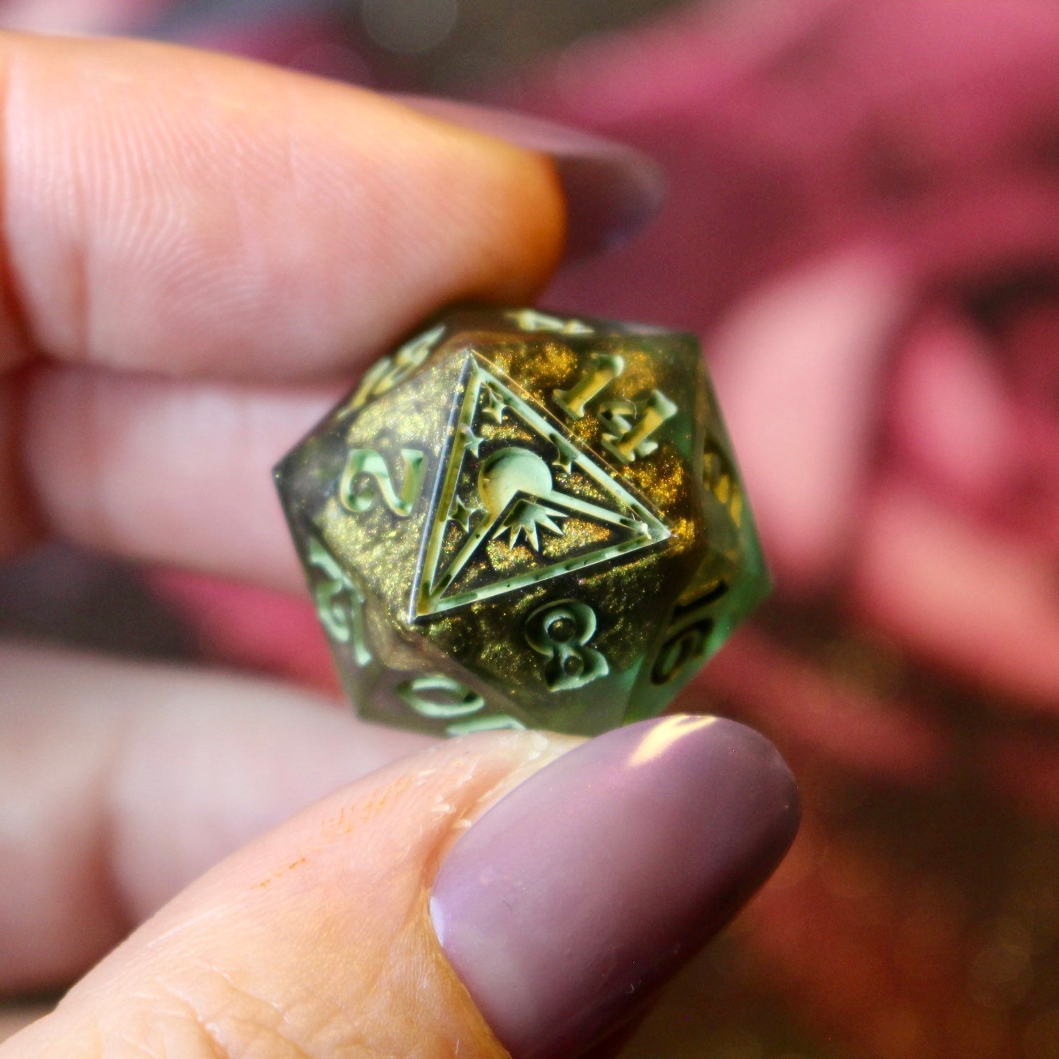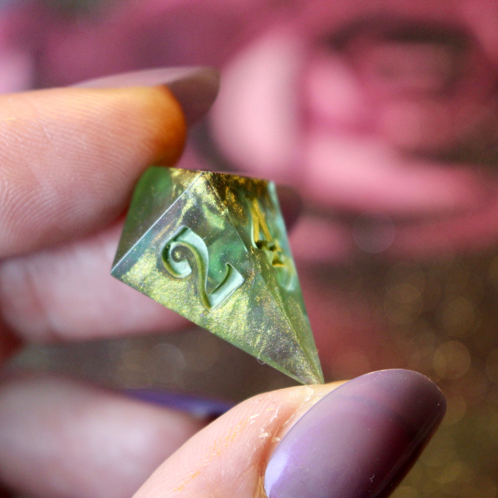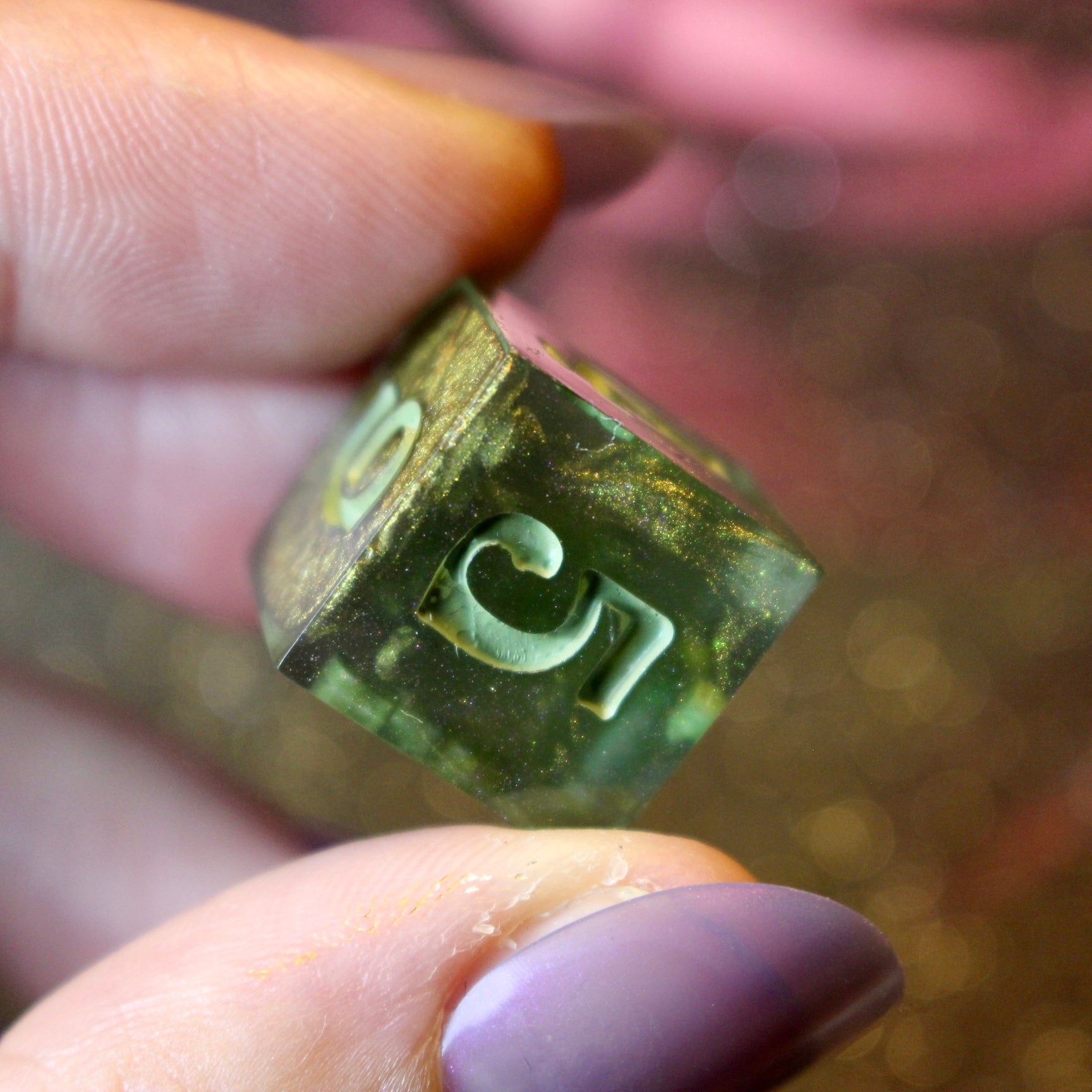 “Swamp Thing" is a set of 7 hand made resin dice, polished and painted by me from non-toxic resin. Featuring swirling green resin with pale green inked numbering.