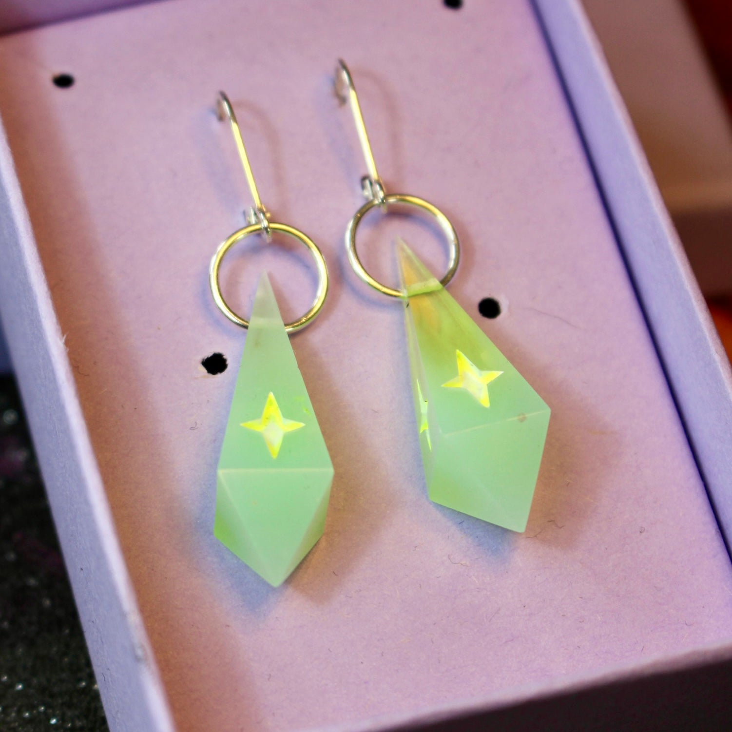 These handmade D4 earrings are the perfect subtle accessory to show off! Made with handmade drop D4s with numbers or stars and 925 sterling silver fixings, each pair are individual and unique in design. The perfect gift for any TTRPG fan and dice goblin!