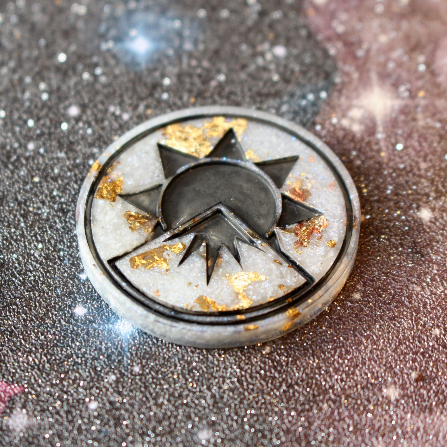 “Paladins Grace" is a set of 9 hand made resin dice, polished and painted by me from non-toxic resin. Featuring white resin with metallic flakes and matte black inked numbering.