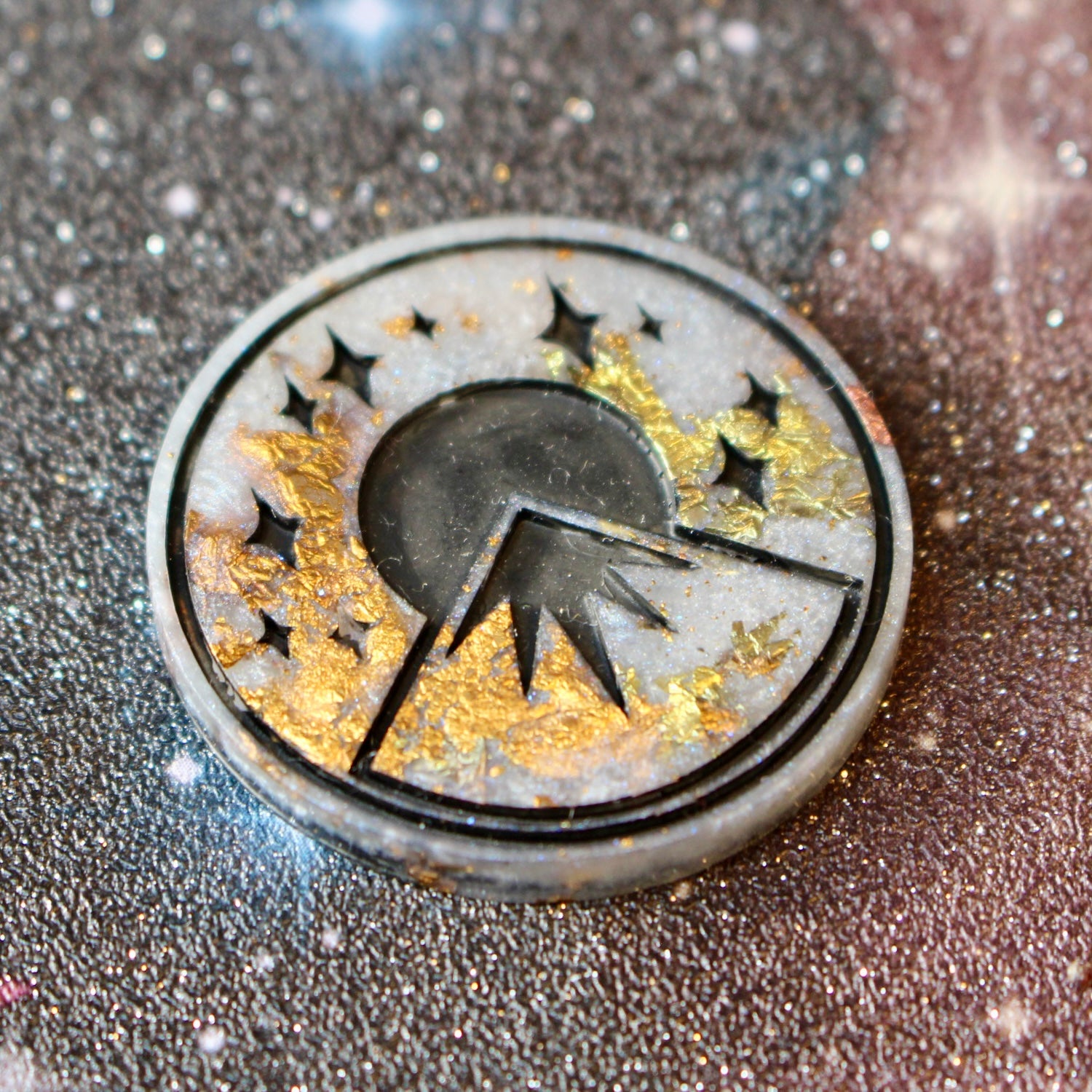 The set consists of my newly styled 9 -piece TTRPG dice set of a D4, 6, 8, 10, 12, 2 x 20 and 100 and an exclusive sun/moon Dark Sky Sice logo coin!