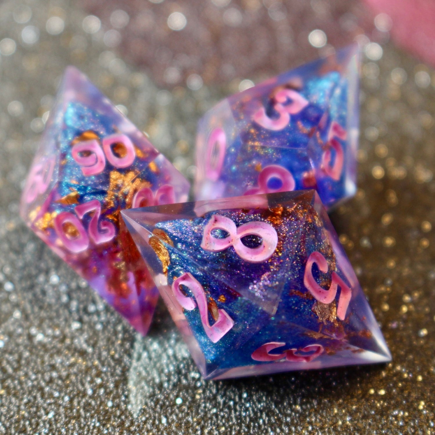 "Astral Treasures" is a set of 7 hand made resin dice, polished and painted by me from non-toxic resin. Featuring shimmering blue and purple resin flecked with metallic foils and cast in clear resin with pastel pink ink.