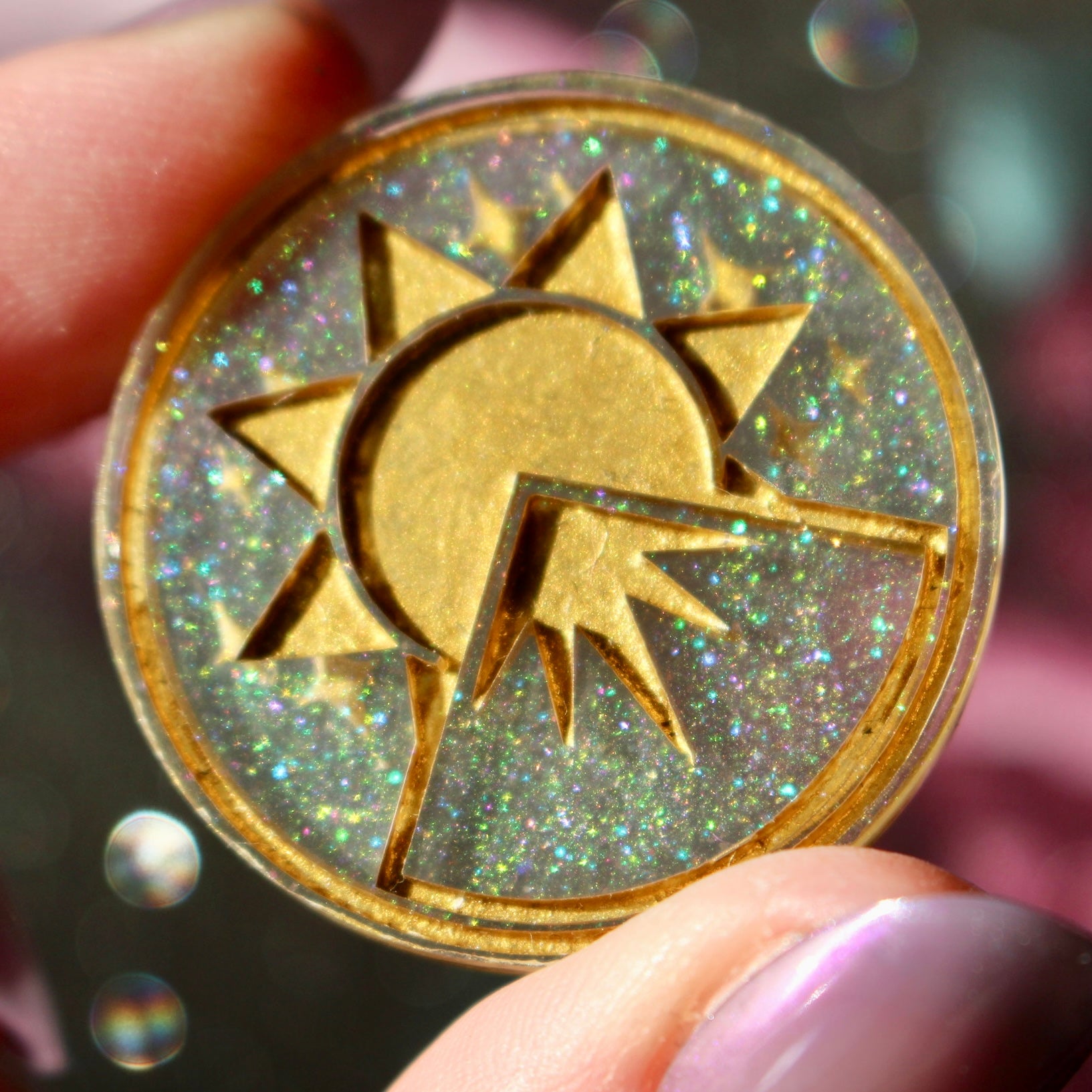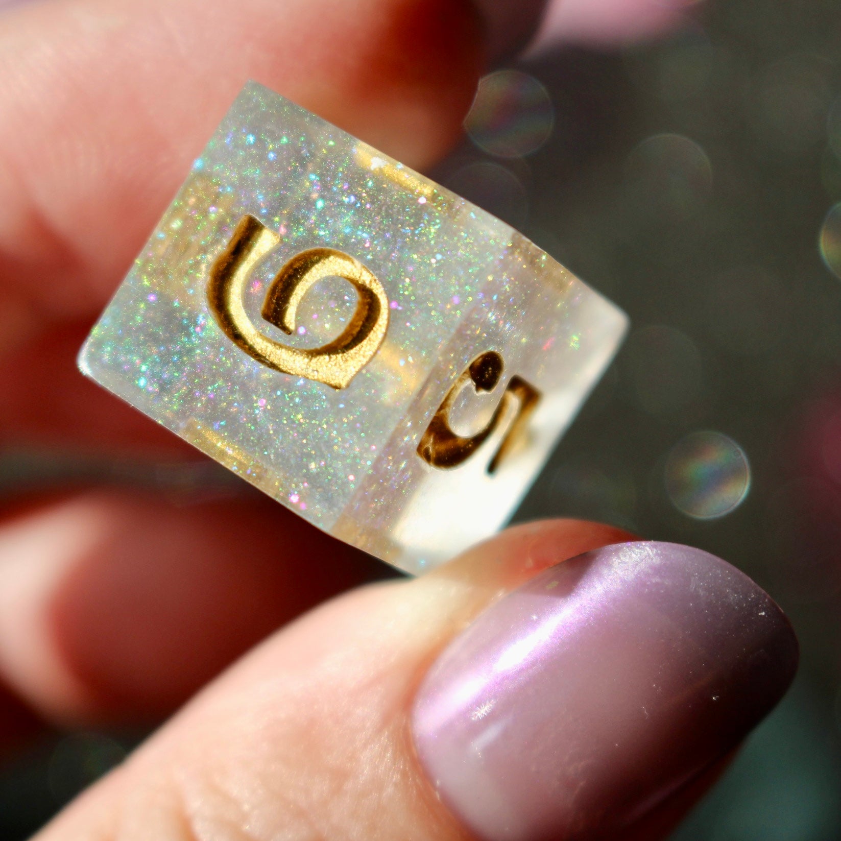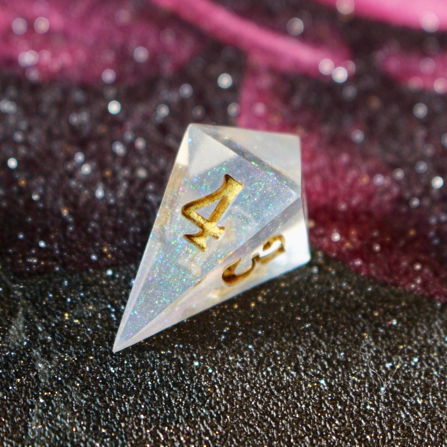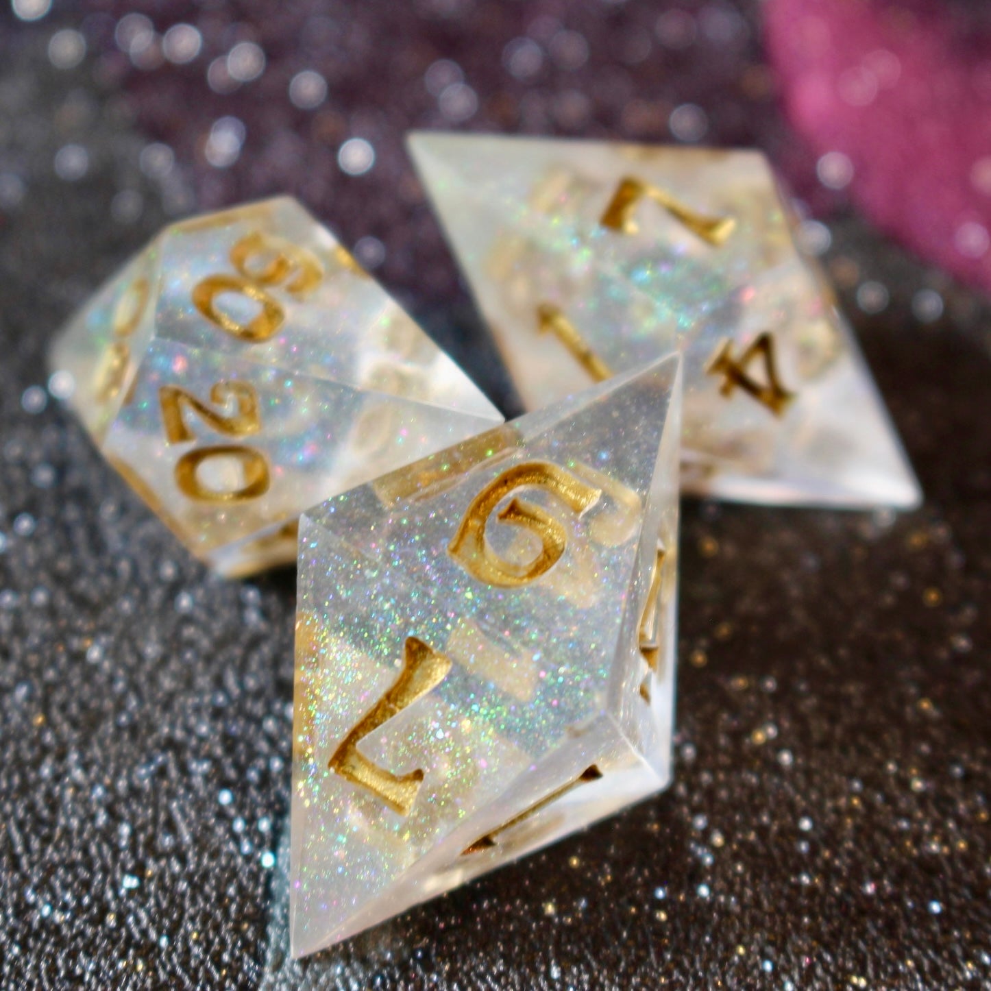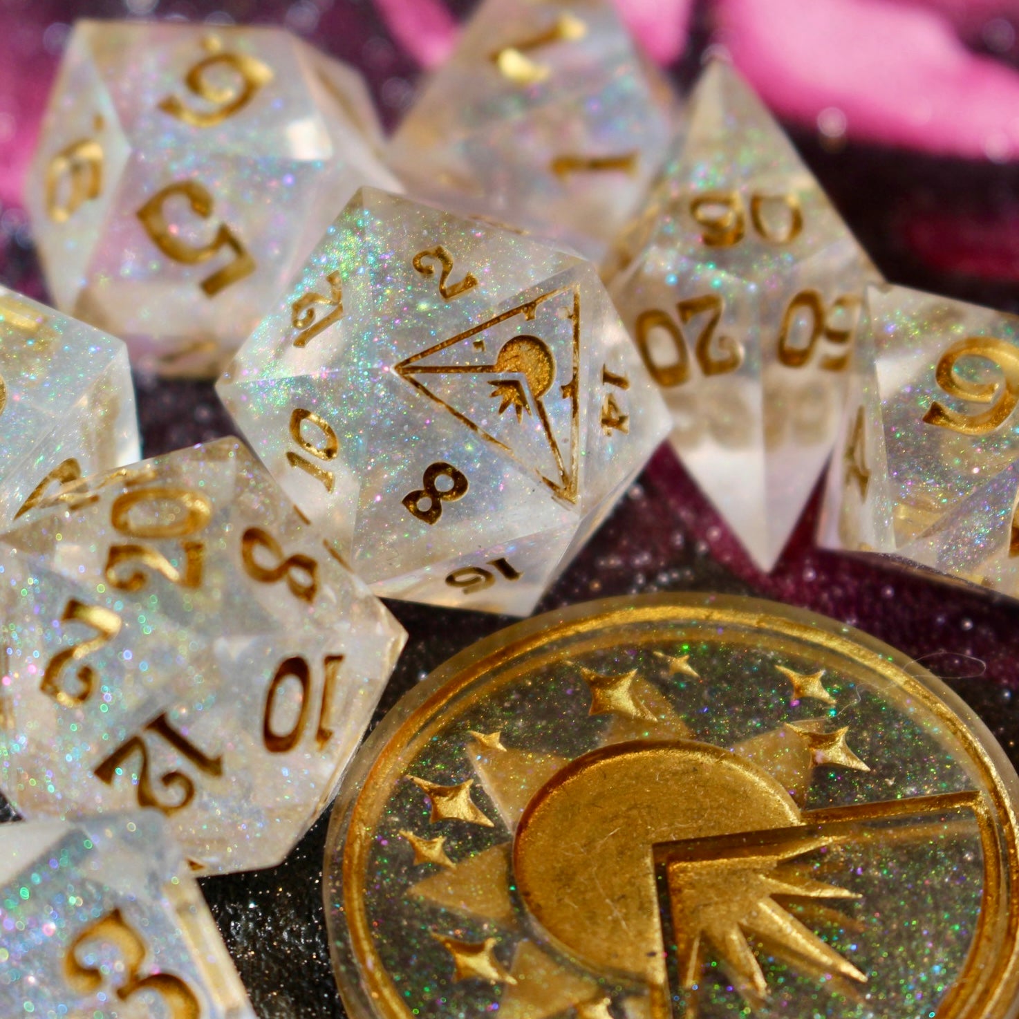“Divine Smite" is a set of 9 hand made resin dice, polished and painted by me from non-toxic resin. Featuring glittering clear resin with gold inked numbering.