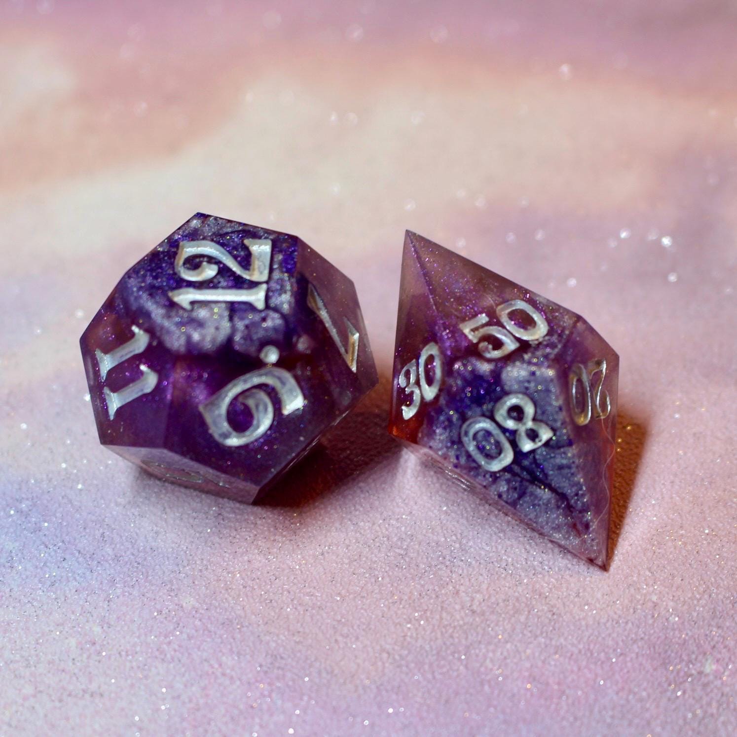 "Frosted Mauve" is a set of 7 hand made resin dice, polished and painted by me from non-toxic resin. Featuring white and purple mica resin with silver inked numbering.