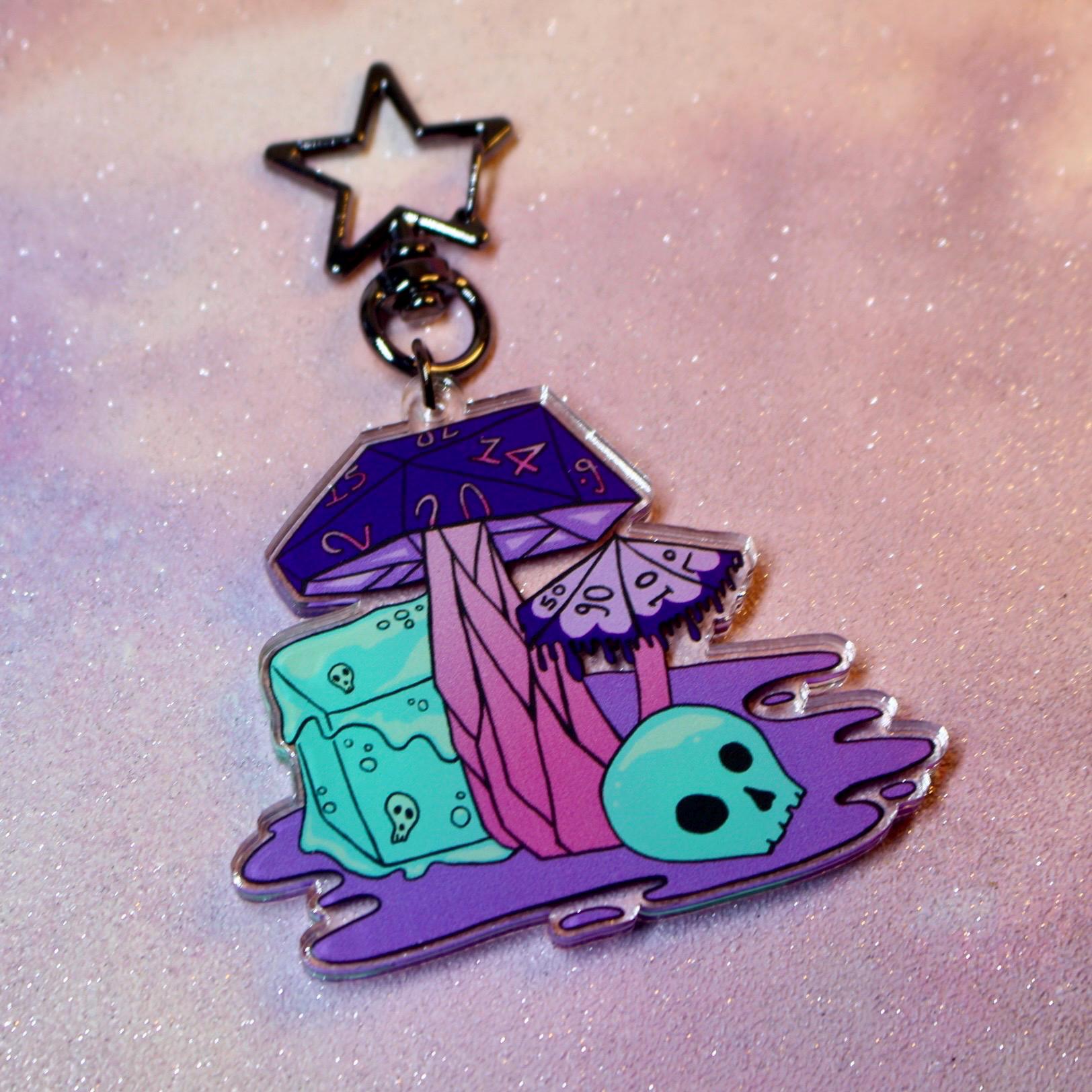 Decorate your bag or keys with this excellent key chain! Made from acrylic and double sided with a cut black metal star fixing, this key chain features my illustration of a gelatinous cube and some dice mushrooms.