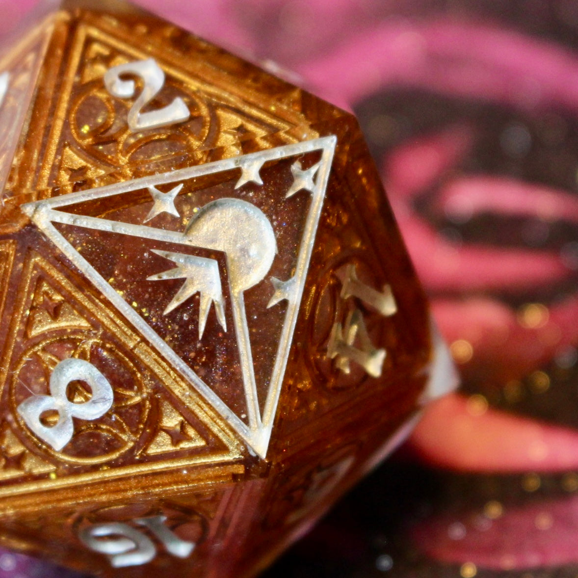 This Lunar D20 features glittering pinkish red resin, rose gold and silver inking. This is the perfect die for those dramatic game-changing moments and would make the perfect gift for any TTRPG player.