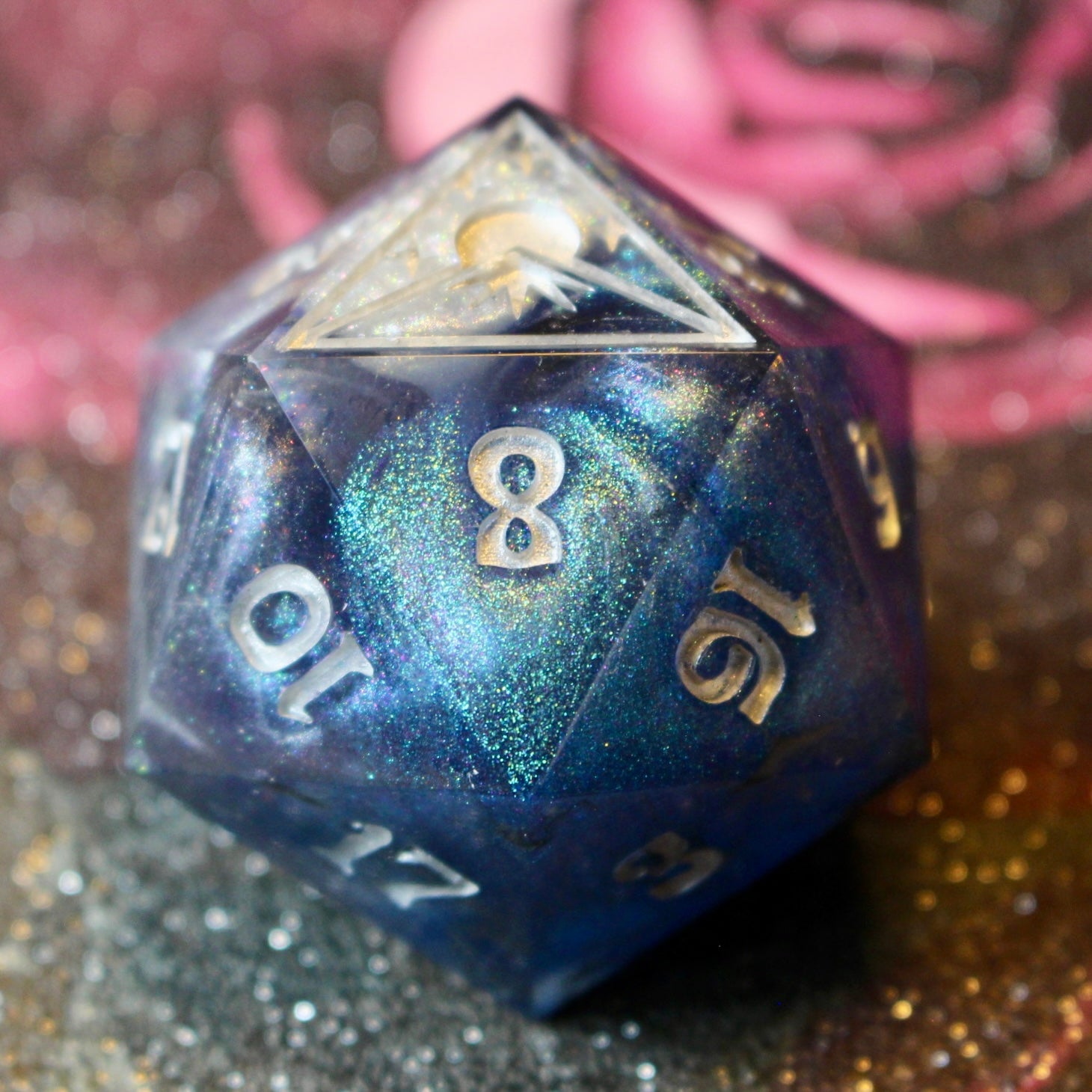 “Glacial Depths" is an oversize 50mm hand made resin D20, polished and painted myself by hand. This is part of my signature range and features the Dark Sky Dice logo.
