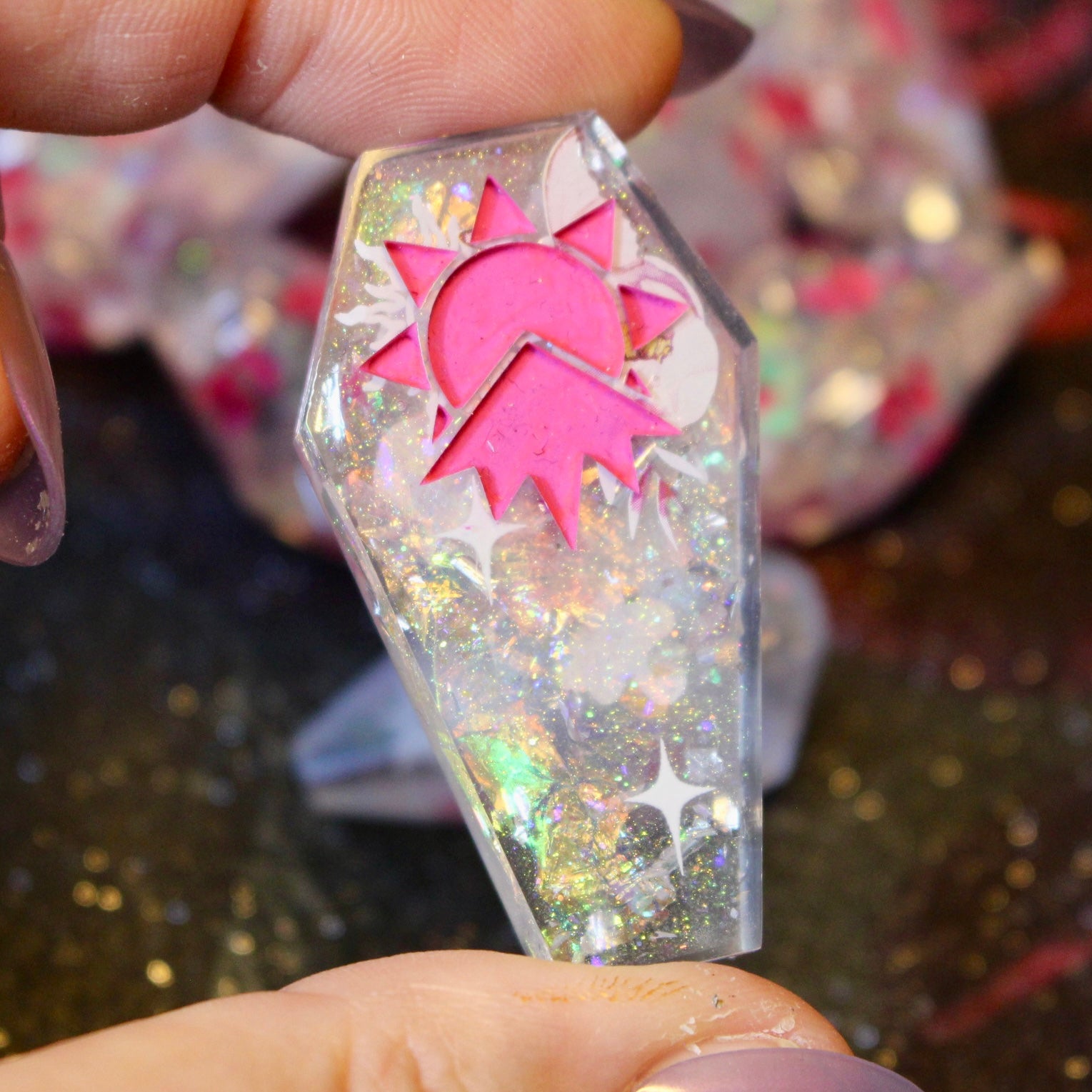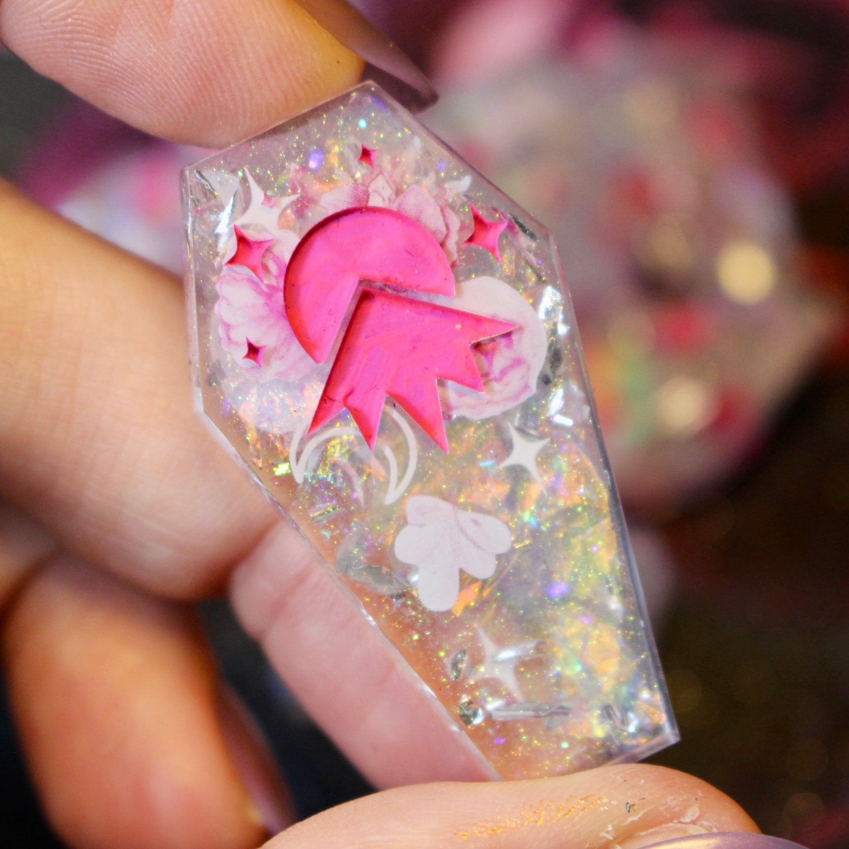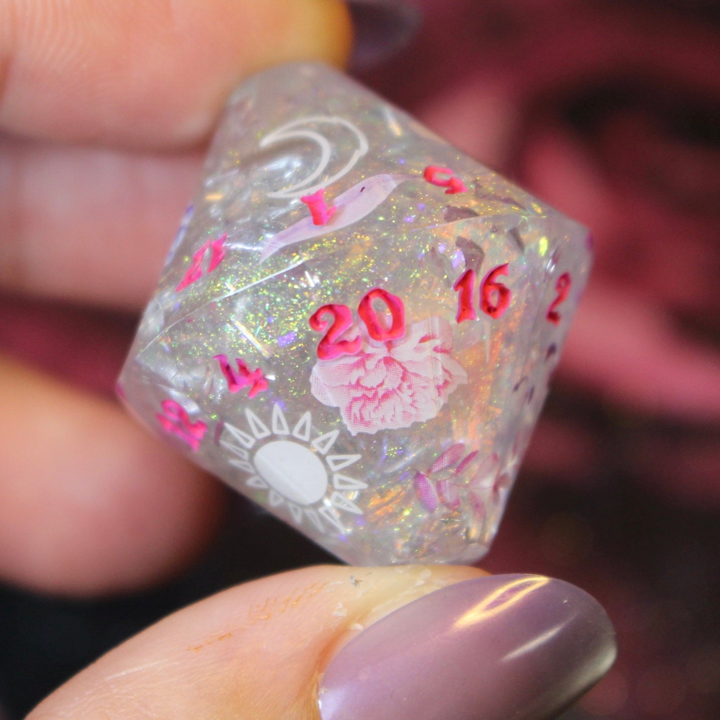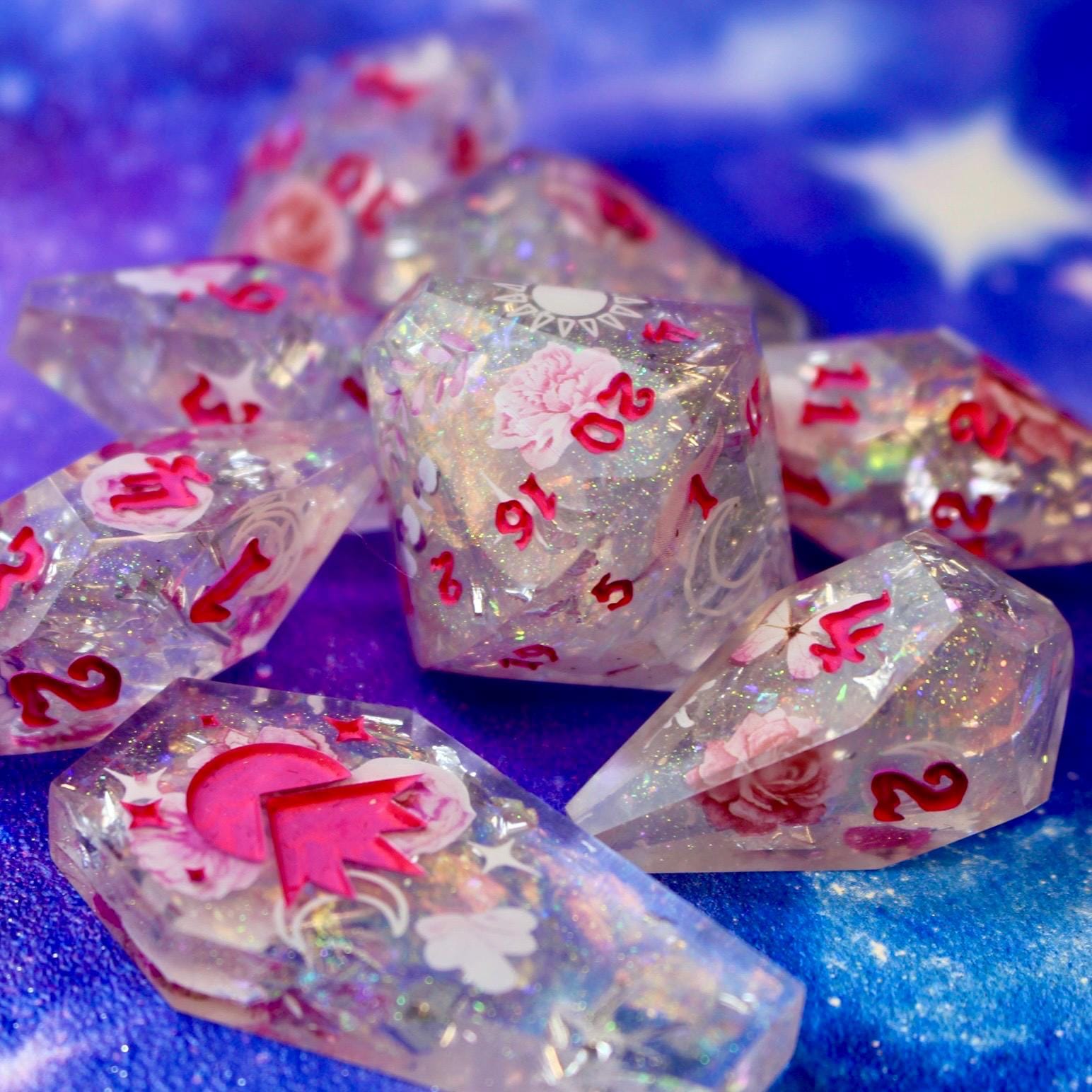 “Glass Coffins " is a set of 8 hand made double cast resin dice, decorated, polished and painted by me from non-toxic resin. These coffin shaped dice bring a truly unique experience to dice rolling and are perfect for gothic set campaigns! Featuring clear glittering resin decorated in pale flowers and white celestial symbols cast in clear resin and vibrant pink inked numbering.