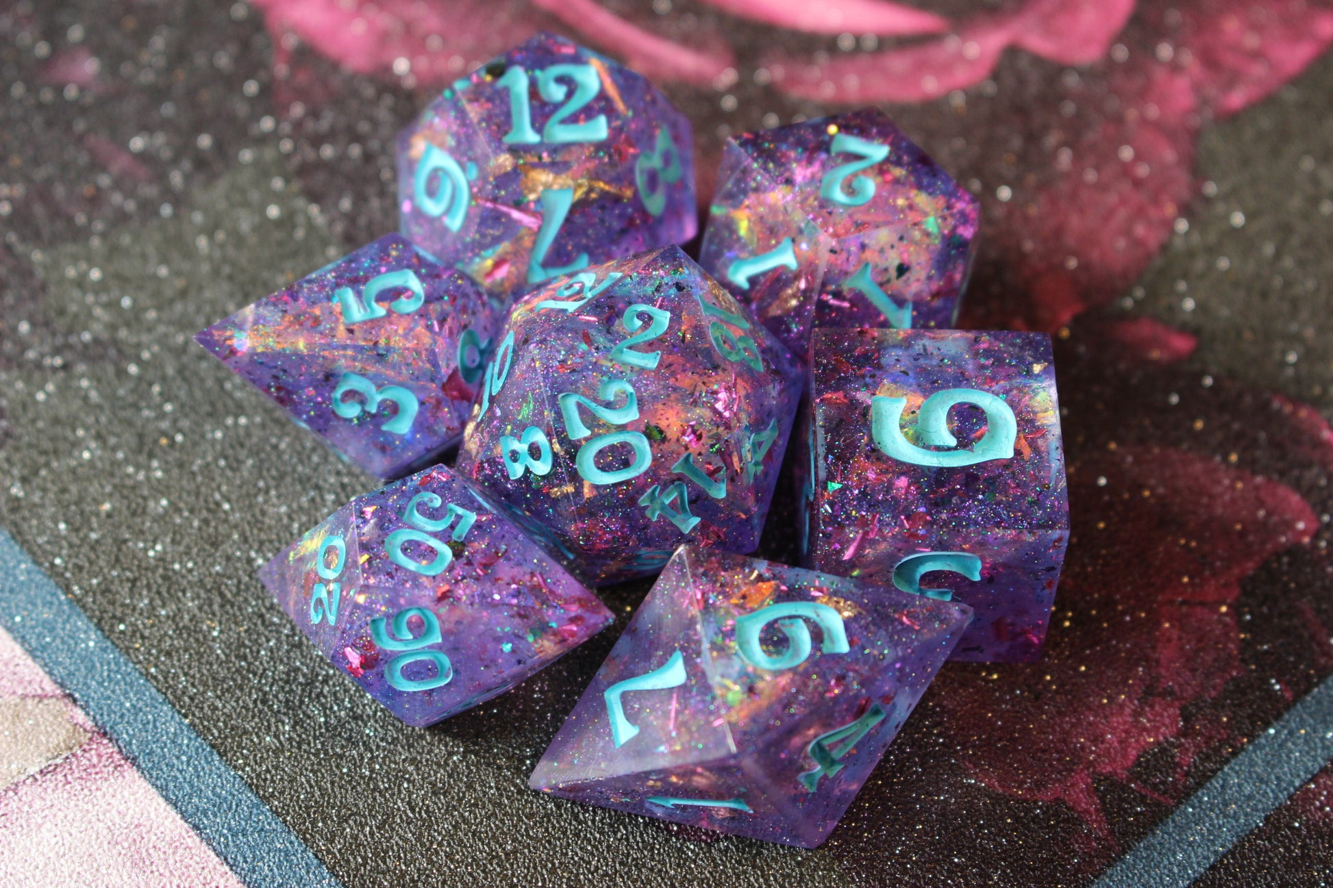 "Lilac Mayhem" is a set of 7 hand made resin dice, polished and painted by me from non-toxic resin. Featuring glittering purple resin with turquoise inked numbering.