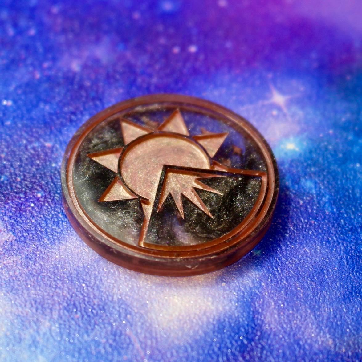 The set consists of my newly styled 9 -piece TTRPG dice set of a D4, 6, 8, 10, 12, 2 x 20 and 100 and an exclusive sun/moon Dark Sky Sice logo coin!